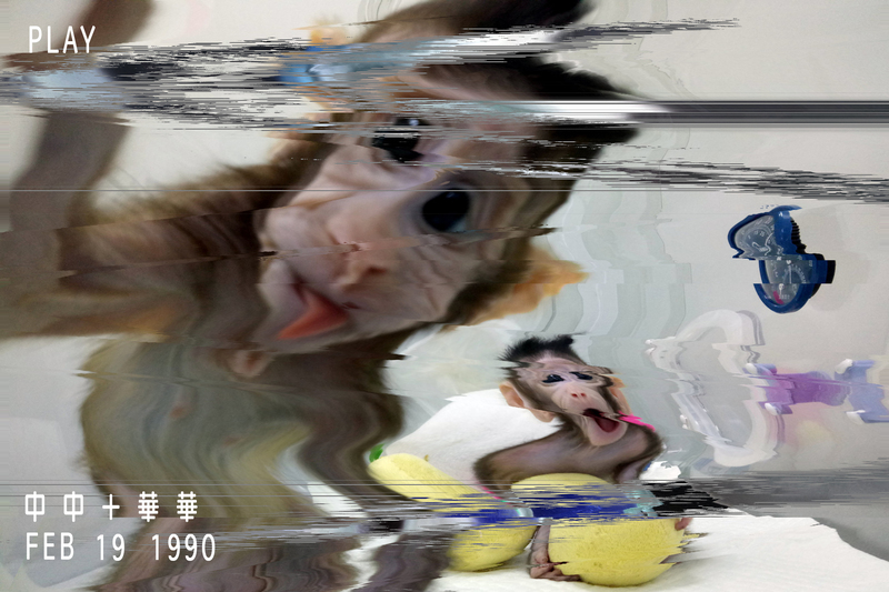 A Photoshopped image with glitches of monkey baby clones conceived by genetic experiment, 2017