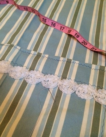 hand-sewing lace onto canvas curtains